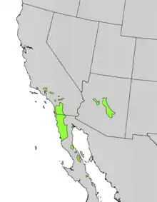 The sugar bush is primarily located in inland localities, as it grades into its relative, the lemonade sumac, near the coast. However, it does occur on Santa Cruz and Catalina Island. It may be found throughout the inland mountains and foothills of Southern California, continuing southward through the Peninsular Ranges of San Diego County into northern Baja California, in the foothills and mountains of the Sierra de Juarez and the Sierra de San Pedro Martir. Further south, more disjunct distributions are found in the sky islands of the Central Desert of Baja California, primarily in the mountains of the Sierra La Asamblea and the Sierra San Borja. The southern limit occurs in Baja California Sur, on the Tres Virgenes volcano.[5] The species is also found distantly in Arizona, on the Mogollon Rim.[6]