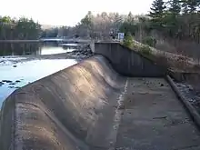 Created near the top of Turkey Hill, the Sugden Reservoir Dam impounds the waters of Shaw Brook and Turkey Hill Creek, creating the Sugden Reservoir for waterpower storage. This waterpower supplied industry in both the Upper and Lower Wire Village, sections of North Spencer, Massachusetts. .[1] The first wire-making industry in the country used this watershed for waterpower. Owned first by the Prouty Brothers (a famous Spencer Family), a wire mill that became Wickwire-Spencer, was purchased by Richard Sugden who improved the mills by creating the Sugden Reservoir in 1882. At one time, Spencer had eleven factories and twenty-six buildings for wire drawing along Turkey Hill Creek and the Seven Mile River.[2] Never used for potable water, this reservoir provided only industrial waterpower storage. The energy storage was considerable because of the high elevation of this reservoir relative to the mouth of Turkey Creek where it enters the Seven Mile River.
