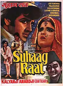 Suhaag Raat (transl. Wedding Night) is a 1968 Hindi-language drama film, produced and directed by R. Bhattacharya under the A.J. Pictures banner. It stars Jeetendra and Rajshree , with music composed by Kalyanji Anandji.[2][3][4][5][6]