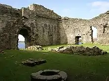 Suibhne is said to have left his name to Loch Sween,[20] and to have built Castle Sween (Scottish Gaelic: Caisteal Suibhne) which overlooks its shores in Knapdale.[21] The castle is thought to date to the late 11th century. It has been described as one of the oldest stone castles in Scotland.[22] The original castle was a simple enclosure, and was abandoned by the MacSweens in the 13th century. The Castle underwent extensive remodelling while in the possession of the Stewart earls of Menteith. In 1310, it was in the possession of Sir John Menteith, when the English king Edward II granted the ancestral MacSween lands to John MacSween and his brothers. The castle was finally destroyed in the mid 17th century.[23]