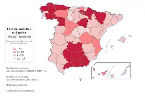 According to WHO's 2016 suicide report, Spain ranked 130th of the 170 countries listed.[1] Spain had an overall suicide rate of 6.1 per 100,000 people, less than most other countries in Europe (e.g. Sweden 11.7/100.000; France 12.3/100.000; Germany 9.1/100.000; UK 7.6/100.000) The reason behind this is unknown; among the many reasons put forward it has been argued that Southern European Mediterranean countries are less prone to suicide for cultural reasons, such as ease of socialisation, deeper religious beliefs that consider suicide as a sin, or just favourable weather conditions rendering less likely seasonal depression. This is consistent with the fact that other southern European countries such as Italy, Greece or Portugal, share a similar low suicidal rate as compared with northern countries. However, exceptions exist since Hungary, a relatively southern country, ranks high in suicidal rates (13.6/100.000, see ref above).