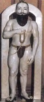 The last stanza praises Ganesha as One who with a pot belly, who wears yellow silken garments. His pot belly is interpreted to have grown his favourite sweet modaks as well as the sins of his devotees, thus absolving them.[7] A serpent is around his waist. He has three eyes and a soft trunk. His third eye is interpreted to the source of knowledge. Lokprabha notes that the third eye, usually not depicted in Ganesha's iconography, is seen in the Ganesha of Morgaon.[7] He is called Vakratunda, "One with a curved trunk".[4][6] Another translation of the word means one who destroys the crooked.[7] In the second last line, the poet's name is given: "Your humble servant Ramadas waits for you to come". Further, the song requests Ganesha, the Lord who worshipped by all, to be pleased with the devotee in trouble and protect him in distress. The chorus is repeated.[4][6]