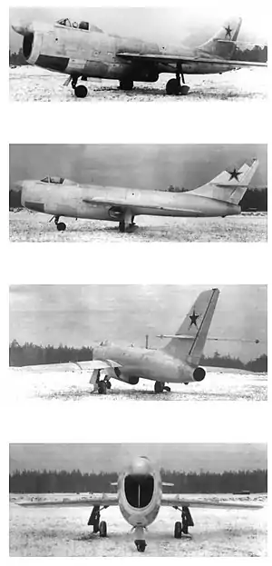 The Su-15 was an all-metal mid-wing monoplane with a 35° swept wing. The aircraft had several very unusual design features. Its twin Klimov RD-45 engines were positioned in tandem rather than side-by-side, due to their large diameter. The front engine sat low with its exhaust under the middle of the fuselage. The rear engine nozzle was at the tip of the aft fuselage. The cockpit had to be offset to the left to make room for the air intake ducting for the rear engine.[2]