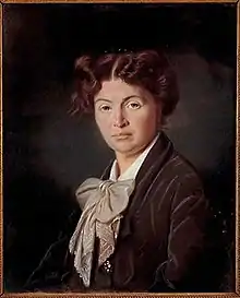 Nadezhda Ivanovna Naryshkina (née Baroness Knorring) at the time of her acquaintance with Sukhovo-Kobylin was married to Prince Aleksandr Grigoryevich Naryshkin.[19] She was a high-society lady who did not lack for suitors, though she was not considered a beauty: contemporaries described her as a woman "of small stature, reddish-haired, with irregular features". At the same time, she possessed "a sort of peculiar grace", knew how to conduct conversations, and was very confident.[20] Seeing how much Sukhovo-Kobylin was suffering because of Simon-Dimanche's death, Naryshkina took upon herself part of the funeral preparations.[21] Eyewitnesses said that she provided substantial support.