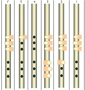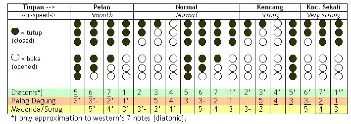 The following picture shows the fingering for a six-holed Sundanese suling.