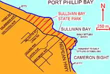 Sullivan Bay lies 60 km (37 mi) due south of Melbourne on Port Phillip, one kilometre (0.6 mi) east of Sorrento, Victoria. It was established as a short-lived convict settlement in 1803 by Lieutenant-Colonel David Collins,[1] who named the bay after the Under-Secretary of State for War and the Colonies, John Sullivan.