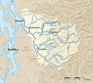 ![]() The Sultan River highlighted on a map of the Snohomish River watershed | |