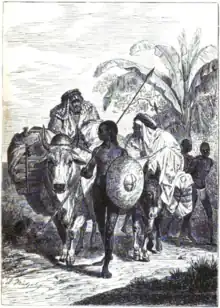 The armies of Darfur underwent a three-staged evolution. Before the 18th century they consisted entirely of levy warbands, youths armed with spears, hide shields and occasionally throwing knives. They were commanded by an older man titled ornang or 'aqid. By the 18th century, a new type of warrior developed, the heavily armoured fursan.[4] They would form the small core of the armies of Darfur.[5] These fursan were armed with long swords imported from Solingen in Germany, lances, maces and sometimes firearms. Body armour consisted of locally made gambesons, German-made mail armour, silk coats, greaves and helmets. The horses were a Nubian breed imported from the Dongola Reach and were purchased with slaves. Like the riders they were armoured with gambesons and mail armour as well as additional armour for the head. All this equipment had to be organized and maintained by the chiefs responsible for the fursan.[6] By the 1850s and 1860s, Darfur entered the third stage, when it attempted to build an army based on muskets. While firearms were already used in Darfur before it was only then when they were used tactically and in large numbers. These experiments were, however, ended with the invasion of al-Zubayr in 1874. Sultan Ibrahim died in a cavalry charge.[7]