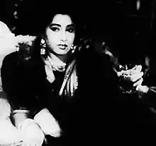 She sustained her career in Bengali cinema also with films such as Abhijog (1947), Pather Dabi (1947), Pratibad (1948), Joyjatra (1948), Swami (1949), Devi Chowdhurani (1949), Samar (1950), Dasyu Mohan (1955).[8] She has been idolized for her role as the beautiful alcoholic wife of a landlord in Kartik Chattopadhyay's cult classic Saheb Bibi Golam (1956) which is an adaptation of Bimal Mitra's classic novel of the same name.[10][11] Her portrayal of Bijali, a nautch girl with a bereaved heart in Haridas Bhattacharya’s National Award winning Bengali film Aandhare Alo (1957) acquired an overwhelmed critical response.[12][10] She also garnered acclamation for her roles in Bengali films such as Ekdin Ratre (1956), Nilachaley Mahaprabhu (1957), Joutuk (1958) and Kinu Gowalar Gali (1964).[10][5] In the late fifties, she was invited to the Asian Film Festival in China as a delegate from India.[10]
