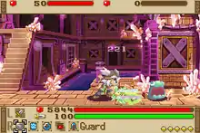 Battles in Summon Night take place inside dungeons. They are initiated as random encounters. On the battle scene, the player will be placed into a small side-scrolling area with one to four opponents. They are able to walk, run, jump, guard, attack, summon their guardian beast and use items. Up to three weapons can be equipped, and up to four different items and spells can be placed onto the guardian beast. This must be set up before a battle begins. If no weapon is available or equipped, the player will be forced to battle with a hammer. During the battle, the player can switch freely between their equipped weapons and use any of the selected items and spells. A battle is won when all opponents have either fled or have been defeated. The main dungeon of the game, The Labyrinth, has fifty floors the player will be required to traverse across the length of the game. After completing the game's main story, the player will unlock an additional fifty floor to explore, featuring new materials to craft with, and new versions of previously fought enemies and bosses.