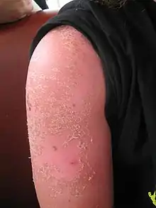 The most common risk of exposure to ultraviolet radiation is sunburn, the speed and severity of which vary among individuals. This can be alleviated at least to some extent by the prior application of a suitable-strength sunscreen, which will also hinder the tanning process due to the blocking of UV light. Overexposure to ultraviolet radiation is known to cause skin cancer,[16] make skin age and wrinkle faster,[17] mutate DNA,[18] and impair the immune system.[19] Frequent tanning bed use triples the risk of developing melanoma, the deadliest form of skin cancer, according to a 2010 study. The study suggests that the melanoma risk is linked more closely to total exposure than it is to the age at which an individual first uses a tanning bed.[20] The International Agency for Research on Cancer places the use of tanning beds in the highest cancer risk category, describing them as carcinogenic to humans even if used as recommended. Frequent tanning also has behavioural reinforcing effects,[21] following UVA radiation epidermal keratinocytes synthesize POMC inducing the production of β-Endorphins which are opioid agonists. An opioid blockade will also then cause withdrawal signs after habitual UV exposure leading to many tanners meeting the DSM-IV criteria for addiction.[22] Several organizations, such as the World Health Organization (WHO), the American Cancer Society and the US Surgeon General have issued guidelines warning about sun tanning and UV radiation exposure, either from the sun or from indoor tanning.[23][24][25] Production of vitamin D is essential for human health. Moderate exposure (avoiding sunburn) to UV radiation provides benefits such as increased vitamin D, as well as other possible benefits that are still being studied.[26] Several tanning activators have used different forms of psoralen, which are known to be photocarcinogenic.[27][28][29] Health authorities have banned psoralen since July 1996.[30]