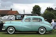 Announced at the beginning of July 1948 this new car by then had been on display in New York, Boston and Toronto.[3] The 1,944 cc four-cylinder engine was redesigned from the preceding Sunbeam-Talbot 2 Litre and still fundamentally the design of the 1937 Hillman 14 now badged Humber Hawk. Now the engine had been given a new cast-iron cylinder head holding overhead valves, the pushrods rising through the old valve guides. Output could now reach 64 bhp (48 kW) at 4100 rpm. The sports saloon weighs 26.25 cwt (2,940 lb; 1,334 kg) The chassis with beam axles and semi-elliptic leaf springs all round was scarcely changed from the same 2 Litre model but provided a wider track. The old basic Lockheed brakes were updated to hydraulic operation. The inevitable post war steering column gear-change proved one of the better versions of this new fad.[4] Close-coupled sports saloon and drophead coupé bodies were fitted to the chassis and the rear wheel openings were covered by metal "spats".