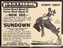 Sundown is a 1924 American silent Western film directed by Laurence Trimble and Harry O. Hoyt, produced and distributed by First National Pictures, and starring Bessie Love. Frances Marion, Marion Fairfax, and Kenneth B. Clarke wrote the screenplay based on an original screen story by Earl Hudson. This film was the only production cinematographer David Thompson ever worked on. This film is presumed lost.[2][3]
