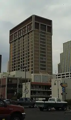 The 19-story tower was approved with casino space on the first four floors, hotel rooms on floors 5 through 10, and office space on the remaining floors.[26] At the end of 1978,[27][28] during construction of the tower, Karadanis had plumbing installed on the office floors, which he now intended to finish as part of the hotel. The city ordered construction to stop, as Karadanis did not have approval for the additional hotel rooms, and the added plumbing was a violation of the city's sewer allocation procedures. Work resumed in January 1979, after Karadanis had the plumbing removed.[26] Karadanis said, "At the time I didn't think putting the plumbing in was such a serious offense." Morris said that converting the "meager" office space into hotel rooms made more economic sense, as large office complexes were scheduled to open elsewhere in the city over the next few years.[29] Two months after work resumed, the Sundowner became the focus of a federal grand jury investigation into sewer allocation procedures being taken by the city.[30][31][32] The grand jury probe requested various documents and building plans related to the ongoing construction of the new tower.[33]