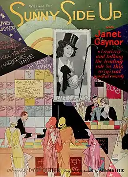 Sunny Side Up (stylized on-screen as Sunnyside Up) is a 1929 American pre-Code Fox Movietone musical film starring Janet Gaynor and Charles Farrell, with original songs, story, and dialogue by B. G. DeSylva, Lew Brown and Ray Henderson. The romantic comedy/musical premiered on October 3, 1929, at the Gaiety Theatre in New York City.[2] The film was directed by David Butler, had (now-lost) Multicolor sequences, and a running time of 121 minutes.