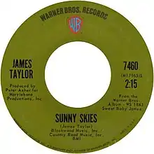 "Sunny Skies" was included on the 1990 version of the compilation album The Best of James Taylor.[5] Taylor wrote the song before being released from his original Apple Records contract, and a demo version of "Sunny Skies" was included as a bonus track of the 2010 CD version of Taylor's first album James Taylor.[1][6] Taylor played the song on 15 May 1980 for the 100th episode of Saturday Night Live.[1]