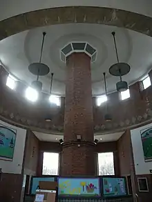 The rotunda is a cylindrical brick structure. Seen from its eastern facade, the rotunda is between and set behind two piers made of Flemish bond brick, each of which contain a flagpole and tile panel. The words sunset play center are inscribed in a granite tablet above the main (eastern) entrance; the entrance itself consists of a set of metal doors. The western entrance, facing the pool, is nearly identical but does not contain flagpoles, and a large NYC Parks logo is hung above that entrance's metal doors.[13] Inside the building, the wall is mostly made of Flemish bond brick with a granite base. The lobby is inside the rotunda and is composed of three parts: the foyer leading east to the entrance, the central cylinder, and the foyer leading west to the pool. The foyers are one story high while the center cylinder is one and a half stories. The curved outer wall is topped by a lintel made of concrete. Light fixtures hang from the white-plaster ceiling. At the clerestory level, near the top of the lobby, there are 16 small windows. The floor is made of dark blue and terracotta tiling and contains several drains.[14]