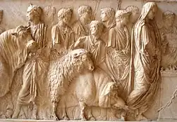 The suovetaurilia or suovitaurilia was one of the most sacred and traditional rites of Roman religion: the sacrifice of a pig (sus), a sheep (ovis) and a bull (taurus) to the deity Mars to bless and purify land (Lustratio).[1][2][3]