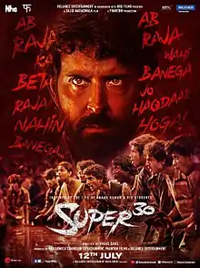 Super 30 is a 2019 Indian Hindi-language biographical drama film produced by Phantom Films, Nadiadwala Grandson Entertainment, Reliance Entertainment and HRX Films at budget of ₹60 crore.[2] Based on the life of mathematics teacher and educator Anand Kumar as well as educational program of the same title, it is directed by Vikas Bahl and stars Hrithik Roshan as Kumar.[3][5]