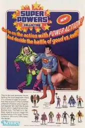 In 1984, DC Comics awarded the master toy license of their characters to Kenner Products, hot on the heels of Mattel's "action feature" heavy Masters of the Universe toy line. The initial pitch seemed to be heavily influenced by Kenner's popular Star Wars toyline with multiple playsets dedicated to individual franchises like Superman, Batman, Wonder Woman, Green Lantern, Teen Titans, Lois Lane, and the Super Jrs.[1] Winning the license away from Mego Corporation and Mattel with an emphasis on action and art, Kenner devised hidden mechanisms within the figures that would trigger an action when the figure's legs or arms were squeezed. This emphasis on each figure's "super power" led to the naming of the line: "The Super Powers Collection". Each figure in the first two series were also packaged with a mini-comic featuring an adventure with a spotlight on that character.