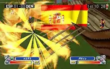 The powers of each team are based on their country's cultural symbols. For example, the Danish team can make a Viking longship to temporarily block a path to goal. When playing as the USA, you can turn a player into the Statue of Liberty to prevent an opponent from scoring. The Saudis can make opponents slip on a large puddle of oil in reference to the country's massive oil wealth, while one of the Paraguayans' special abilities is also a reference to Shaolin Soccer, where the goalkeeper throws the ball straight at the goal, mowing down opponents along the way. The abilities can be executed with L1 plus either Triangle, Square or X. Different special moves use different amounts of players' teams special energy. Also, every team has a powerful player with an "S" over their head, who can make attacks they specialize in more powerful. The players can also use old-fashioned passes and footwork to outmaneuver its opponent, though characters move a little stiffly, especially on turns. It was done in part to simulate more realistic movement in the sport.