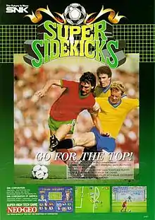 Super Sidekicks[lower-alpha 1] is a 1992 soccer arcade video game developed and published by SNK. It is the first installment in the eponymous series and the second soccer game released for Neo Geo MVS, succeeding Soccer Brawl (1991). Featuring an arcade-style approach to soccer compared to other games released at the time, the title allows players to choose any of the available game modes with AI-controlled opponents or other human players with the team of their choosing. Its gameplay uses a simplified two-button configuration.