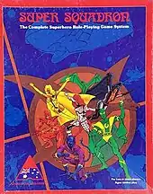 Super Squadron is a superhero role-playing game system.[1] The "Rule Book" (60 pages) covers character creation and descriptions of over 75 powers, magic spells, artifacts, encounters, world background, and romantic involvements.[1] The "Adventure Book" (24 pages) includes 10 miniscenarios of gradually increasing complexity that teach the GM and player how to play.[1] The game comes with a character record sheet pamphlet.[1]
