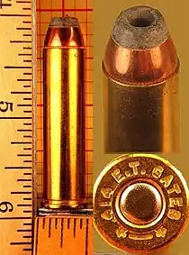 Based on the .44 Magnum cartridge, the .445 SuperMag is a high pressure cartridge and will allow higher muzzle velocities than most .44 Magnum cartridges. .445 cartridges are designed for long range hunting and target revolvers. Capable of knock-down performance surpassing 200 yards for Silhouette and 150 yards for hunting applications. The .445 Super Magnum can drive a heavy 300 grain bullet 120 ft/sec faster than the .44 Magnum cartridge. While Dan Wesson handguns in .445 SuperMag ceased production in 2007, custom ammunition producers like Buffalo Bore continue to offer loaded ammunition. Starline brass is still available and custom manufacturers occasionally offer T/C Encore barrels. A revolver designed for the .445 SuperMag can also fire the shorter .44 Magnum, .44 Special, and the .44 Russian cartridges.[1]