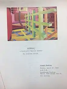 Following the musical theater workshop presentations, Larson began putting on both private readings of the full musical, as well as public readings at Naked Angels and The Public Theater in 1987.[1] With Sondheim's help, Larson won the Richard Rodgers Development Grant for Superbia at the end of 1987, and used the money to fund a reading in December 1988 at Playwrights Horizons, produced by Ira Weitzman and directed by R. J. Cutler.[1][9] The reading ended up being a disappointment for Larson, largely because he was unable to get a full rock band for his score, and was only allowed to have union performers, not the non-union actors whom he had written the show for. As a result, Larson's attempt at blending genres was lost in the single piano accompaniment, and the actors who were trained in more traditional musical theater were unable to perform the pop-rock vocals that the piece required. Sondheim, who had come to support his pupil, left after the first act.[3]: 53 As a direct response to this failed workshop, Larson's friend Victoria Leacock helped Larson produce a concert version of Superbia at the Village Gate on September 11, 1989.[1] Unlike the Playwrights Horizon workshop, this concert used a live band and the non-union actors Larson had wanted in his cast, including Bart and Timothy Britten Parker. The concert was one of only two times Superbia was performed with a full band.[3]: 53–54