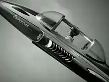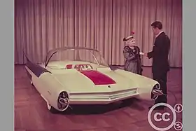 There were several working models of Supercar, which was designed by art director Reg Hill.[7] The larger, hero model was about seven feet (2.1 m) long and cost £1,000 to build.[1] Made of lightweight wood and Perspex (Plexiglas), it was constructed was built by Laurie Barr of Aeronautical and General Modelmakers (now Mastermodels). A mid sized model, around one metre (3 ft 3 in) long and sculpted by Slough craftsman Bill James, as well as a smaller model measuring about 0.5 metres (1 ft 8 in), were used for the titles. One of the smaller models, used in distance shots, was about nine inches (23 cm) in length and was also sculpted by Bill James. Fans such as Austin Tate have speculated that Hill was inspired by the style of vehicles such as the 1954 Ford FX-Atmos concept car.[8] In 1959, Ford displayed an actual flying car, the Ford Levacar Mach I.