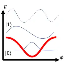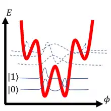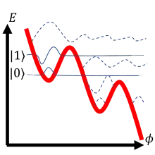 ![]() , also known as "washboard" potential. Bias current is adjusted to allow wells shallow enough to contain exactly two localized wave functions. A slight increase in bias current causes a selective "spill" of higher energy state (), expressed with a measurable voltage spike (a mechanism commonly used for phase qubit measurement). |