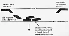 The causes of supercontinent assembly and dispersal are thought to be driven by convection processes in Earth's mantle. Approximately 660 km into the mantle, a discontinuity occurs, affecting the surface crust through processes involving plumes and superplumes (aka large low-shear-velocity provinces). When a slab of the subducted crust is denser than the surrounding mantle, it sinks to discontinuity. Once the slabs build up, they will sink through to the lower mantle in what is known as a "slab avalanche". This displacement at the discontinuity will cause the lower mantle to compensate and rise elsewhere. The rising mantle can form a plume or superplume.[1]