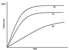 The extraction curve of % recovery against time can be used to elucidate the type of extraction occurring. Figure 4(a) shows a typical diffusion controlled curve. The extraction is initially rapid, until the concentration at the surface drops to zero, and the rate then becomes much slower. The % extracted eventually approaches 100%. Figure 4(b) shows a curve for a solubility limited extraction. The extraction rate is almost constant, and only flattens off towards the end of the extraction. Figure 4(c) shows a curve where there are significant matrix effects, where there is some sort of reversible interaction with the matrix, such as desorption from an active site. The recovery flattens off, and if the 100% value is not known, then it is hard to tell that extraction is less than complete.