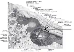 The medial wall and part of the posterior and anterior walls of the right tympanic cavity, lateral view. (Artery not shown, but tensor tympani muscle indicated with arrow)