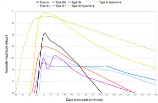 A super-luminous supernova (SLSN, plural super luminous supernovae or SLSNe) is a type of stellar explosion with a luminosity 10 or more times higher than that of standard supernovae.[1] Like supernovae, SLSNe seem to be produced by several mechanisms, which is readily revealed by their light-curves and spectra. There are multiple models for what conditions may produce an SLSN, including core collapse in particularly massive stars, millisecond magnetars, interaction with circumstellar material (CSM model), or pair-instability supernovae.