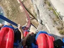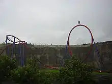At the time of the ride's announcement, construction had already begun on unused land bordered by quarry walls and an irrigation pond.[5][6] The initial plans for the ride specified it would have seven inversions including a 114-foot-tall (35 m) vertical loop and a 96-foot-tall (29 m) dive loop.[6] Following the ride's announcement, the design was altered to remove the dive loop and increase the size of the vertical loop to 145 feet (44 m).[7][8] This saw Superman: Krypton Coaster obtain the record for the world's tallest vertical loop when it officially opened to the public on March 11, 2000.[7] It held the title for 13 years until the addition of Full Throttle at Six Flags Magic Mountain in 2013.[8]
