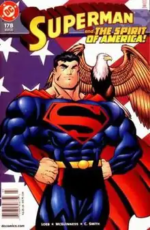 Because the DC Universe was revamped after the events of Crisis on Infinite Earths, the previous continuity before that series (colloquially referred to as "pre-Crisis") was voided. Previously established characters were given the opportunity to be reintroduced in new ways. Reintroductions of classic villains were part of the new Superman series' first year, featuring the first post-Crisis appearances of characters such as Metallo[3] and Mister Mxyzptlk[4] and the introduction of Supergirl.[5] The historic engagement of Lois Lane and Clark Kent[6][7] was one of the major events in the book's run. Writer/artist Dan Jurgens created a supporting hero named Agent Liberty[8] in issue #60 (Oct. 1991). The series participated in such crossover storylines as "Panic in the Sky".[9] The hallmark of the run was the storyline "The Death of Superman". The actual "death" story was published in this series' 75th issue,[10][11] and would be a major media and pop culture event with the issue going on to sell over three million copies.[12][13][14]