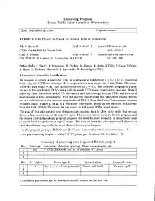 The High-Z Supernova Search Team was an international cosmology collaboration which used Type Ia supernovae to chart the expansion of the universe. The team was formed in 1994 by Brian P. Schmidt, then a post-doctoral research associate at Harvard University, and Nicholas B. Suntzeff, a staff astronomer at the Cerro Tololo Inter-American Observatory (CTIO) in Chile. The original team first proposed for the research on September 29, 1994 in a proposal called A Pilot Project to Search for Distant Type Ia Supernova to the CTIO. The original team as co-listed on the first observing proposal was: Nicholas Suntzeff (PI); Brian Schmidt (Co-I); (other Co-Is) R. Chris Smith, Robert Schommer, Mark M. Phillips, Mario Hamuy, Roberto Aviles, Jose Maza, Adam Riess, Robert Kirshner, Jason Spiromilio, and Bruno Leibundgut. The original project was awarded four nights of telescope time on the CTIO Víctor M. Blanco Telescope on the nights of February 25, 1995, and March 6, 24, and 29, 1995. The pilot project led to the discovery of supernova SN1995Y. In 1995, the HZT elected Brian P. Schmidt of the Mount Stromlo Observatory which is part of the Australian National University to manage the team.
