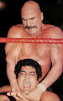 During his time with the AWA, Graham feuded with Gagne, The Crusher, The Bruiser, Wahoo McDaniel, Billy Robinson, Ken Patera and Ivan Koloff, the latter becoming his tag-team partner.[2] By this time, Graham was integrating into his performances not only arm wrestling contests but also weightlifting challenges (mainly involving ex-Olympian Ken Patera) and posing routines.[19] One of his most memorable feuds was against McDaniel, with whom he wrestled numerous bouts between 1973 and 1974.[20] Among the matches they participated in were Indian Strap matches.[20] It was during the feud with McDaniel that Superstar also teamed with Koloff to take on McDaniel and The Crusher in tag team matches.[21] It was also during his time in the AWA that he began wrestling Ivan Putski.