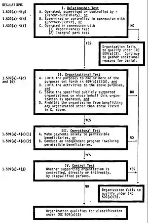 This part provides three possible relationships between a supporting organization and its supported organizations. A supporting organization must fulfill the requirements of one of these three types and report it in its annual reporting to the IRS. Through either of these relationships the supported organizations provides the requisite public scrutiny over the supporting organizations. Type I resembles a parent-subsidiary relationship.[19] Type II resembles a brother-sister relationship.[20] These two types are the stricter of the relationships while Type III has the most relaxed standard for scrutiny by the supported organizations. In exchange for this flexibility, type III supporting organizations must pass two additional tests to ensure that the supported organizations provide public scruinty.[21] The first test is the responsiveness test and the second test is the integral part test.[21] The integral part test may further breakdown into two subtests, the "but for" subtest and the "attentiveness" subtest, either of which the organization may satisfy.[22] This type III relationship,[20] however, recently has received a crackdown by Congress and so its flexibility and relaxed standards for control and scrutiny is short-lived.