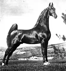 Supreme Sultan started his show ring career as a two-year-old.[4] Tom Moore showed two-year-old Sultan in fine harness, winning the Illinois and Indiana Futurities. He also won the two-year-old stakes at the Chicago International, and the American Royal.[1] He was noted for being more refined in appearance than other Saddlebreds of his time, and also admired for his very high and elegant action, particularly in his hindquarters.[4] His influence as a sire changed the look of the American Saddlebred breed, and he is considered the horse who changed the look of the breed to the phenotype seen today.[1]