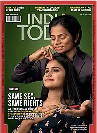 A gay couple, Supriya Chakraborty and Abhay Dang, filed a petition seeking legal recognition of their marriage in the Supreme Court of India on 14 November 2022.[33] A two-judge Bench of the Supreme Court, consisting of Chief Justice of India D.Y. Chandrachud and Justice Hima Kohli, admitted the petition along with another gay couple, Parth Phiroze Mehrotra and Uday Raj Anand, on 25 November 2022.[1]