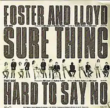 "Sure Thing" is a song written and recorded by American country music duo Foster & Lloyd. It was released in September 1987 as the second single from their self-titled debut album. It reached number 8 on both the Billboard Hot Country Songs chart and the Canadian RPM country Tracks chart in 1987.