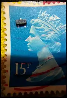 A MOSFET transistor, placed upon a British postage stamp for size comparison.