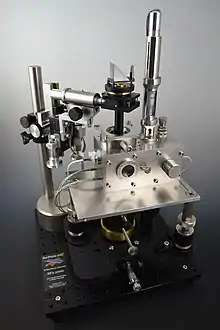 The Surface Force Apparatus (SFA) is a scientific instrument which measures the interaction force of two surfaces as they are brought together and retracted using multiple beam interferometry to monitor surface separation and directly measure contact area and observe any surface deformations occurring in the contact zone. One surface is held by a cantilevered spring, and the deflection of the spring is used to calculate the force being exerted.[2] The technique was pioneered by David Tabor and R.H.S. Winterton in the late 1960s at Cambridge University.[3] By the mid-1970s, J.N. Israelachvili had adapted the original design to operate in liquids, notably aqueous solutions, while at the Australian National University,[4] and further advanced the technique to support friction and electro-chemical surface studies[5] while at the University of California Santa Barbara.