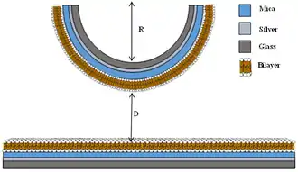 Early experiments measured the force between mica surfaces in air or vacuum.[6] The technique has been extended, however, to enable an arbitrary vapor or solvent to be introduced between the two surfaces.[7] In this way, interactions in various media can be carefully probed, and the dielectric constant of the gap between the surfaces can be tuned. Moreover, use of water as a solvent enables the measurement of interactions between biological molecules (such as lipids in biological membranes or proteins) in their native environment. In a solvent environment, SFA can even measure the oscillatory solvation and structural forces arising from the packing of individual layers of solvent molecules. It can also measure the electrostatic 'double layer' forces between charged surfaces in an aqueous medium with electrolyte.
