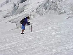 To determine mass balance in the accumulation zone, snowpack depth is measured using probing, snowpits or crevasse stratigraphy. Crevasse stratigraphy makes use of annual layers revealed on the wall of a crevasse.[14] Akin to tree rings, these layers are due to summer dust deposition and other seasonal effects. The advantage of crevasse stratigraphy is that it provides a two-dimensional measurement of the snowpack layer, not a point measurement. It is also usable in depths where probing or snowpits are not feasible. In temperate glaciers, the insertion resistance of a probe increases abruptly when its tip reaches ice that was formed the previous year. The probe depth is a measure of the net accumulation above that layer. Snowpits dug through the past winters residual snowpack are used to determine the snowpack depth and density. The snowpack's mass balance is the product of density and depth. Regardless of depth measurement technique the observed depth is multiplied by the snowpack density to determine the accumulation in water equivalent. It is necessary to measure the density in the spring as snowpack density varies. Measurement of snowpack density completed at the end of the ablation season yield consistent values for a particular area on temperate alpine glaciers and need not be measured every year. In the ablation zone, ablation measurements are made using stakes inserted vertically into the glacier either at the end of the previous melt season or the beginning of the current one. The length of stake exposed by melting ice is measured at the end of the melt (ablation) season. Most stakes must be replaced each year or even midway through the summer.