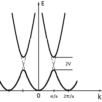 demonstrating the band splitting at the edges of the Brillouin zone, where the width of the forbidden gap is given by 2V. The electronic wave functions deep inside the crystal, attributed to the different bands are given by