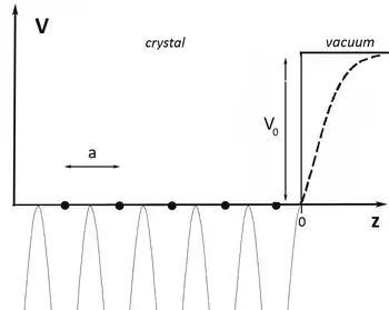 A simplified model of the crystal potential in one dimension can be sketched as shown in Figure 1.[3] In the crystal, the potential has the periodicity, a, of the lattice while close to the surface it has to somehow attain the value of the vacuum level. The step potential (solid line) shown in Figure 1 is an oversimplification which is mostly convenient for simple model calculations. At a real surface the potential is influenced by image charges and the formation of surface dipoles and it rather looks as indicated by the dashed line.