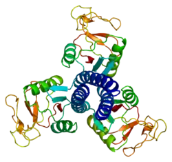 Surfactant protein D, also known as SP-D, is a lung surfactant protein part of the collagenous family of proteins called collectin.[5] In humans, SP-D is encoded by the SFTPD gene[6][7] and is part of the innate immune system.[8][9] Each SP-D subunit is composed of an N-terminal domain, a collagenous region, a nucleating neck region, and a C-terminal lectin domain.[5][10] Three of these subunits assemble to form a homotrimer, which further assemble into a tetrameric complex.[5][10]